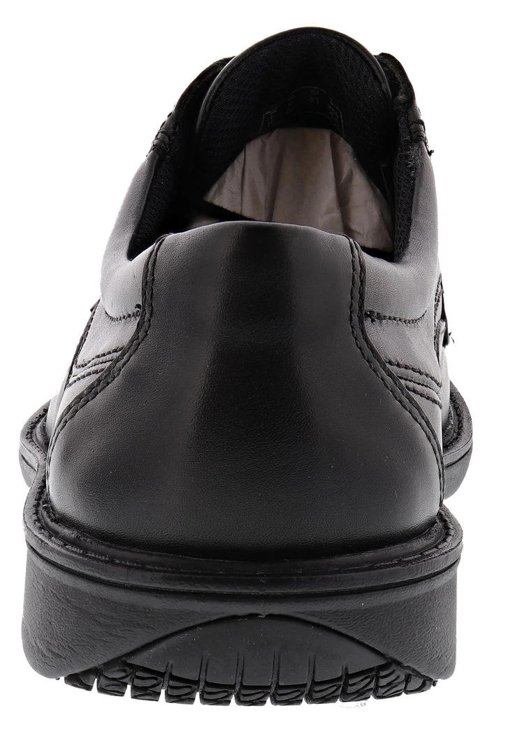 These Wader Pure, men’s comfortable Non slip bottoms shoes, black leather. The flexible elastic gore provides this full grain leather style with an easy, slip-on fit. Durability comes courtesy of a rubber outsole with a lightweight EA midsole, and its Ultimate Comfort features include a moisture wicking OrthoLite® footbed. One of the best dress shoes for standing all day