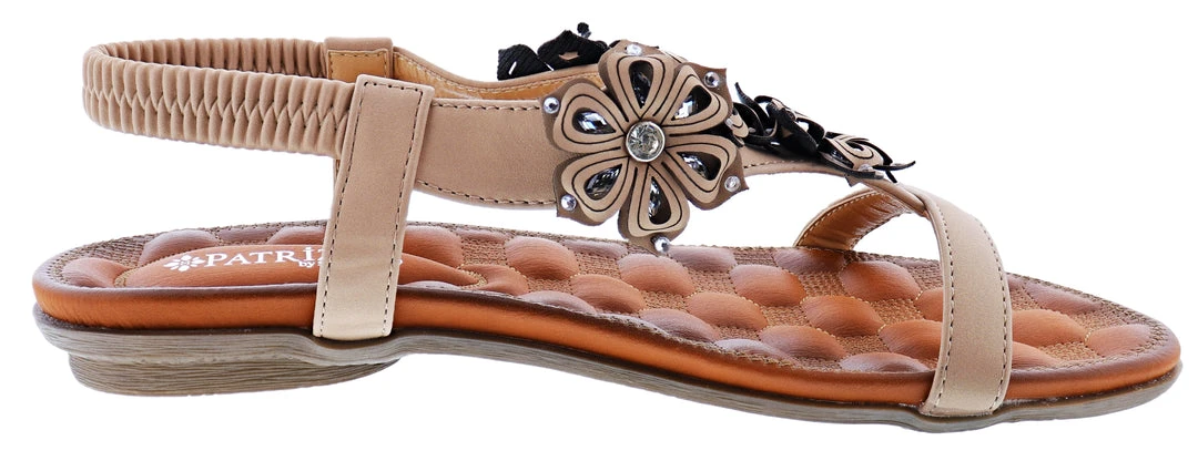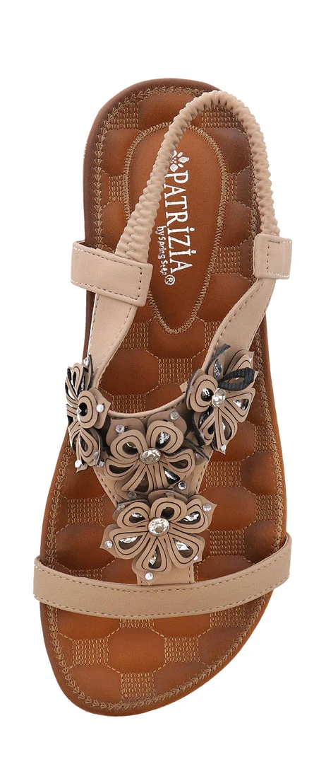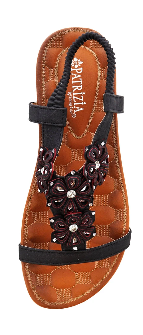 Patrizia Indra T-Strap Sandals, a beautiful floral and cute rhinestone sandals applique. This cute comfortable sandals for women are quilted with a cushioning footbed and an elastisized back strap all on a nature-inspired comfort flat. Order your cute dress summer sandals today!ort flat.