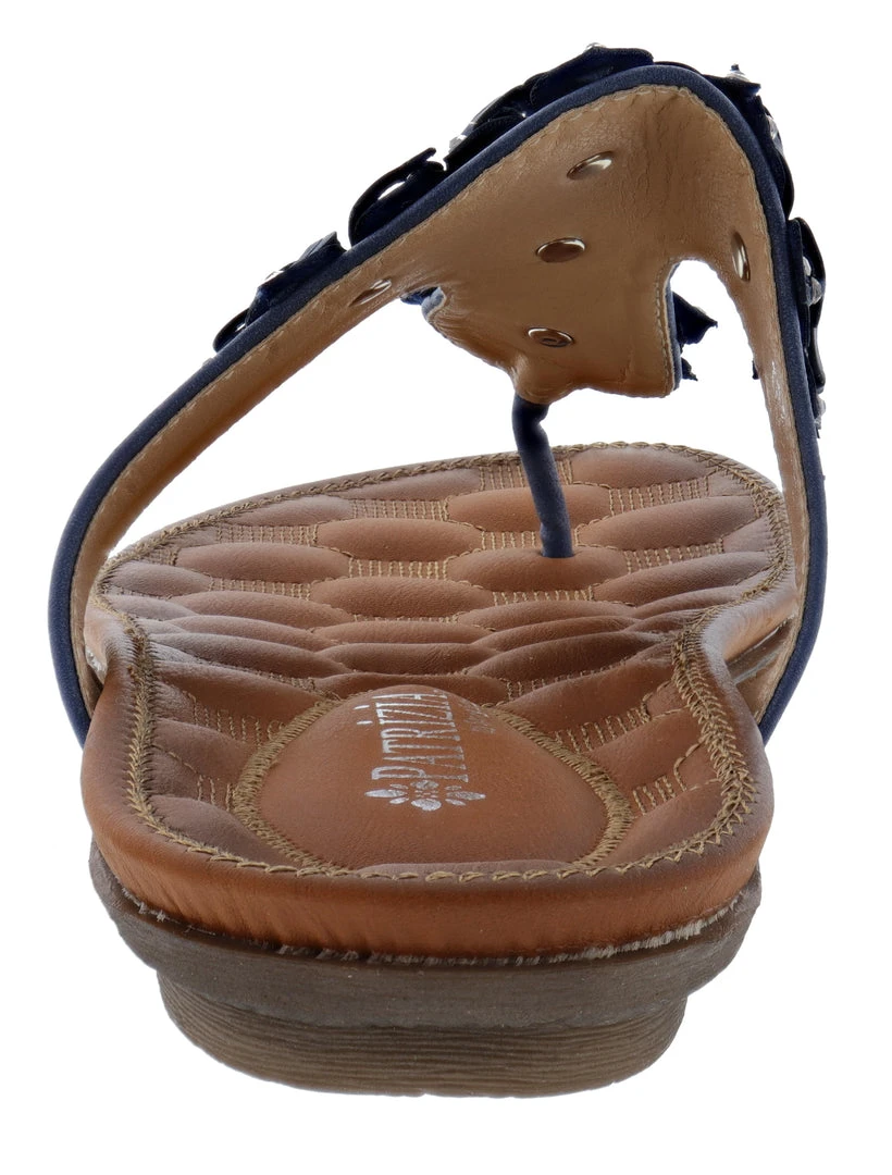 Trendy thong sandal featuring a beautiful floral and rhinestone applique, quilted comfort cushioning footbed, and tonal stitching all on a nature-inspired comfort flat.
