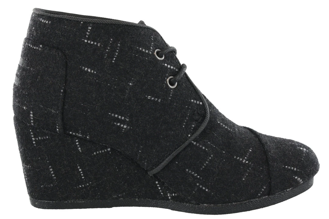- Toms Women Desert Wedge Lace Up Booties has the perfect blend of chic style and easy comfort. Dressy bootie shoes making it ideal for strolls through the city and nights out with your friends. Cut out bootie shoes Lightly cushioned foot bed provides both comfort and support. Order your womens Toms today!
