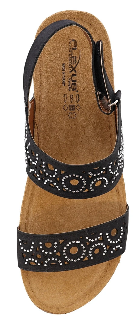 Flexus Style: TACIA Our Flexus by Spring Step TACIA comfort sling back sandal is a comfortable sandal with decorative cutout and rhinestone details that take the sporty look up a notch. Easy to wear and enjoy with two straps, hook and loop closure and a full length contoured padded footbed and a polyurethane wedge outsole.